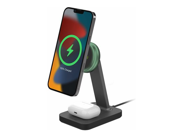 Magnetic Latch+ ladestativ og Pad+ lar deg lade telefonen og hodetelefonene på kort tid. Stativet holder enheten i stående eller liggende modus og leverer opptil 7,5-15 W trådløs kraft. Så du kan se TV-programmer, videochatte eller skanne meldinger mens telefonen er magnetisk festet til snap+-stativet og nettbrettet. Det er til og med et dedikert sted å lade AirPods.