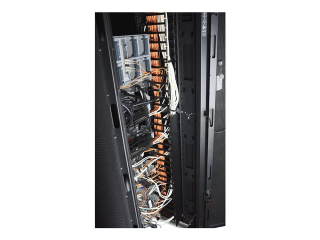 The vertical channels have smooth plastic fingers at 1U increments to allow patch cords to enter and exit in an organized manner.