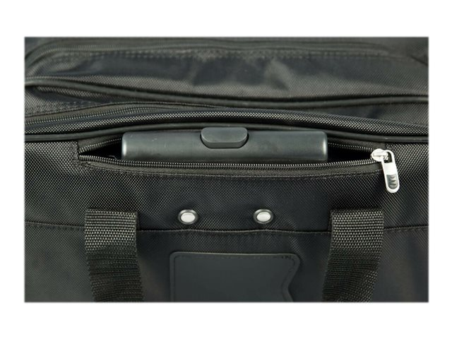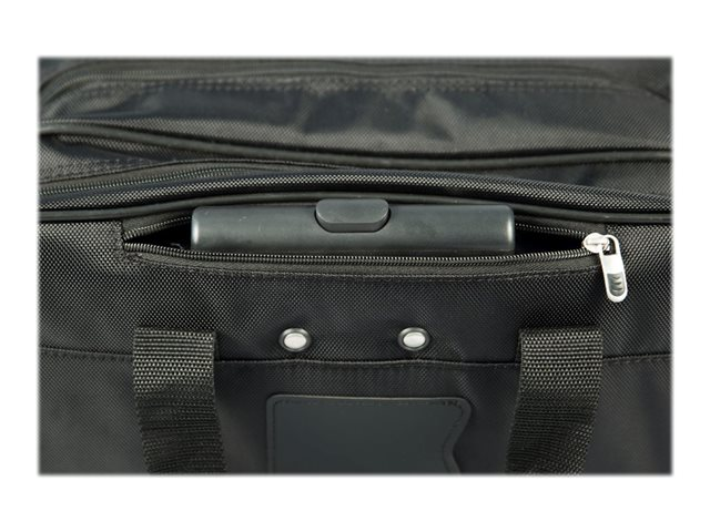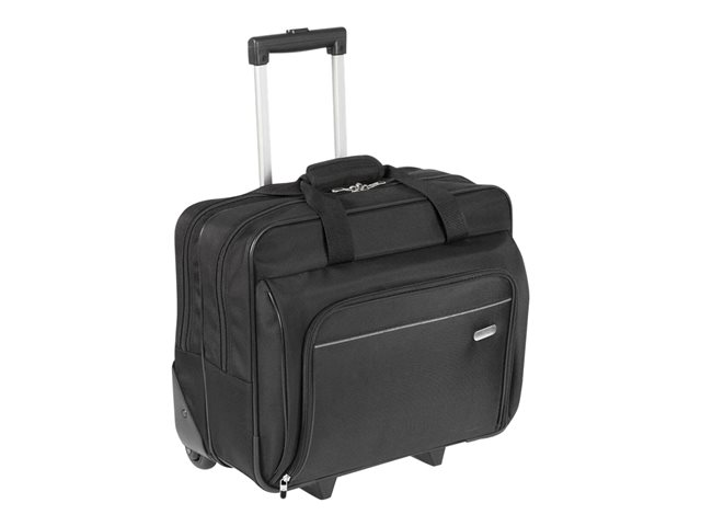 Targus-trillevesken er designet for å beskytte laptoper med en skjermstørrelse på opptil 15 - 16". Skumpolstringen med lukket cellestruktur beskytter laptopen samtidig som det slitesterke/vanntette 1200D-polyestermaterialet holder eiendelene dine tørre når det regner. I vesken, som har glidelås foran, finner du pennholdere, holdere til visittkort, lomme med glidelås, en lomme til telefon og en stor pose for ekstra tilbehør. Trillevesken for laptop gir deg i tillegg et romslig oppbevaringsrom med glidelås for nødvendig kontorutstyr eller klesskift. Teleskophåndtaket trekkes inn i en glidelåslomme når det ikke er i bruk, og vesken har et dobbelt bærehåndtak som gjør den ekstra bærevennlig. Trillevesken for laptop er en funksjonell reiseveske for alle som reiser mye i forbindelse med jobben.